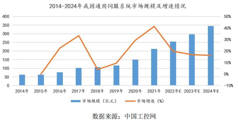 伺服系统应用市场目前属于市场成长期,伴随产业升级,设备加工精度的要求提升,将为伺服系统产品创造较大的市场成长空间。根据中国工控网数据显示,2016年至2021年,我国伺服系统市场规模从2016年的76.5亿元上升至212亿元,复合增长率达22.61%。