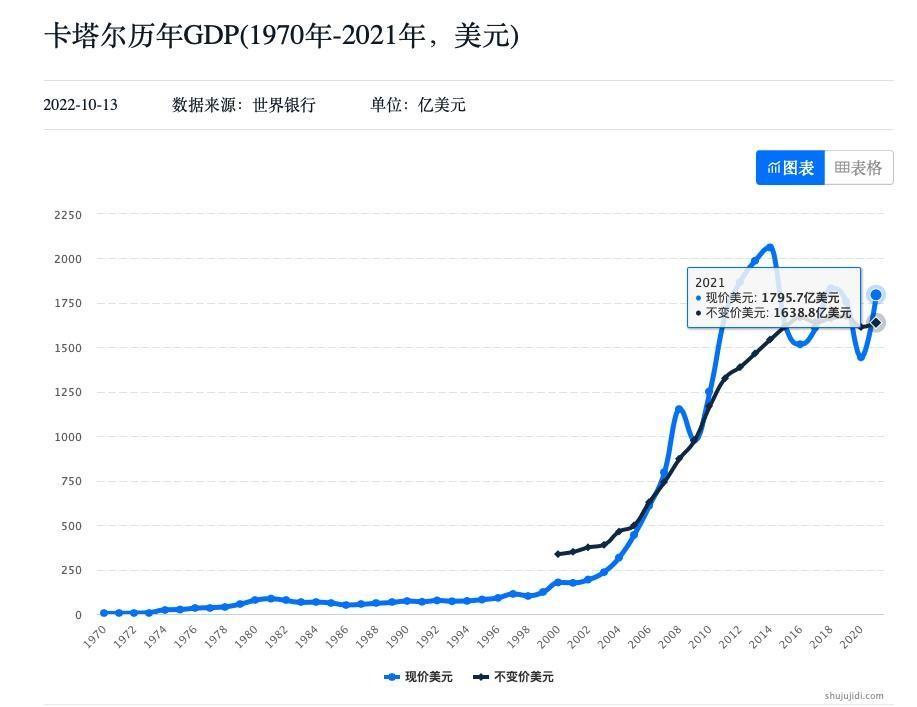 最新的数据显示,卡塔尔2021年的GDP总产值1692亿美元(约合人民币1212.06亿元),中国2021年的GDP总产值为114.37万亿元。