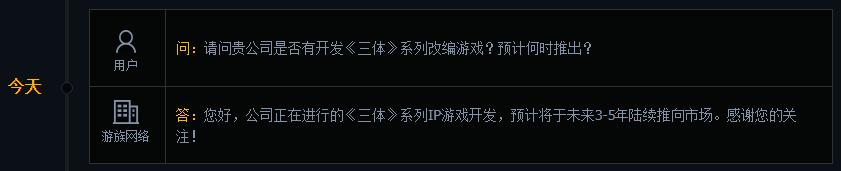 36氪获悉,游族网络在投资者互动平台表示,公司正在进行的《三体》系列IP游戏开发,预计将于未来3-5年陆续推向市场。