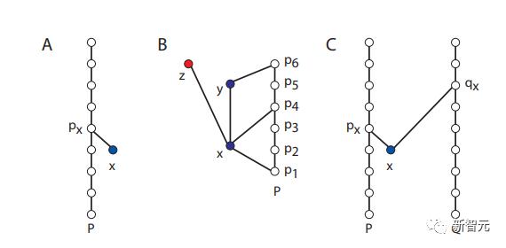 (A) 一个事件x在一条链上的投影是链上包括x的最小事件;(B) 在这个位置集中,元素x和y可以被链P所量化,元素z则不能被量化;(C) 元素的多个链可以用来量化元素的数量