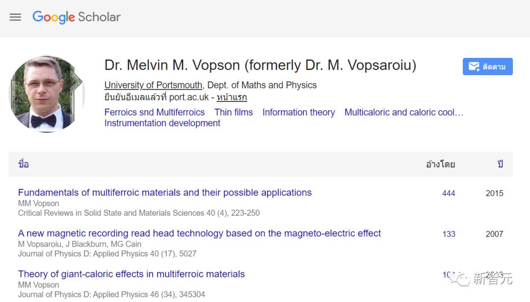 根据作者的Google Scholar显示,Vopson的主要研究兴趣集中在「铁素体和多铁素体」、「薄膜」、「信息论」、「多热量和热量冷却」和「仪器开发」,论文共获得2345次引用。