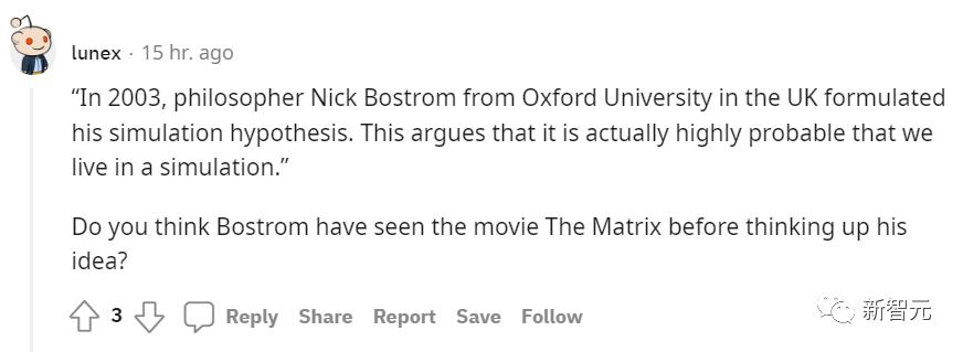 对此,也有人很认真地分析到,「2003 年,英国牛津大学的哲学家Nick Bostrom提出了他的模拟假说,这表明我们实际上很可能生活在模拟中。你认为Bostrom在这之前看过电影《黑客帝国》吗?」。