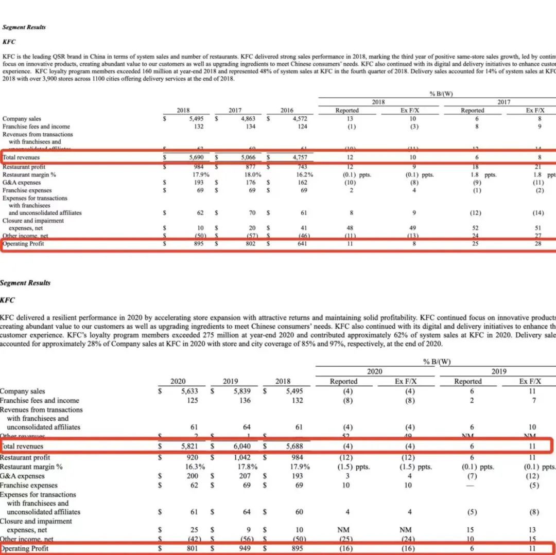 肯德基在中国的母公司百胜中国财报显示,在疫情之前,肯德基的营收和经营利润已经出现增长放缓。2017年-2019年,肯德基的营收增速分别为6%、12%、6%,与之对应的经营利润同比增速由25%下滑至6%。