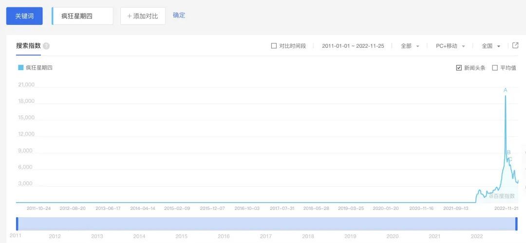 “疯狂星期四”确实给肯德基的业绩带来了利好。根据百度指数,疯狂星期四的高关注度出现在今年6月-9月,8月达到高峰,之后则迅速滑落并逐渐冷却。
