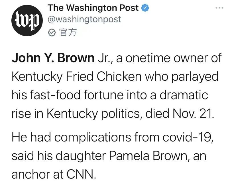 据《华盛顿邮报》报道,约翰·布朗于11月21日去世,享年88岁。在肯德基七十年的发展历程中,有两位重要的领路人:一位是肯德基创始人哈兰·桑德斯,也就是花白胡子的肯德基老爷爷,已经于上世纪八十年代去世;另一位就是带领肯德基成功上市的约翰·布朗。