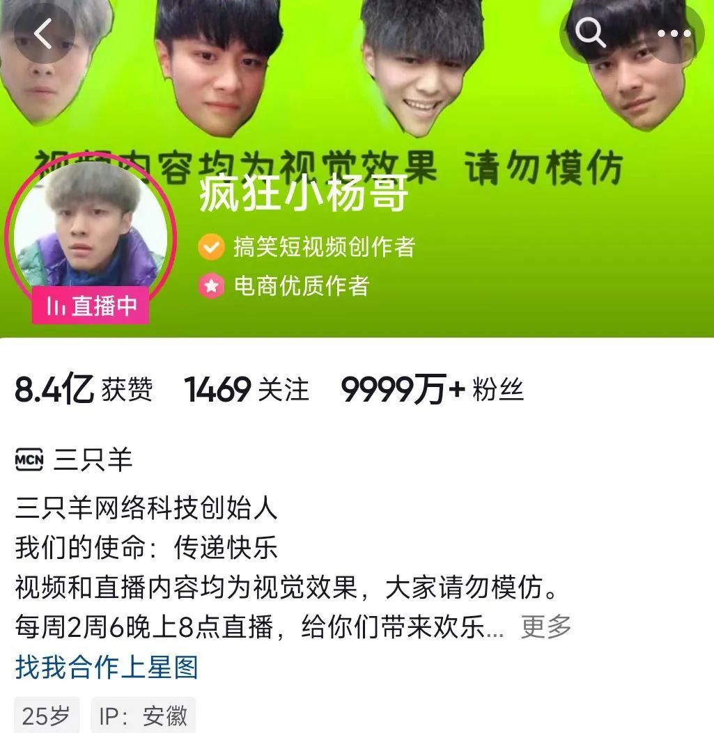 2022年11月3日,抖音账号疯狂小杨哥粉丝数量破亿,成为抖音平台第一个粉丝过亿的主播。