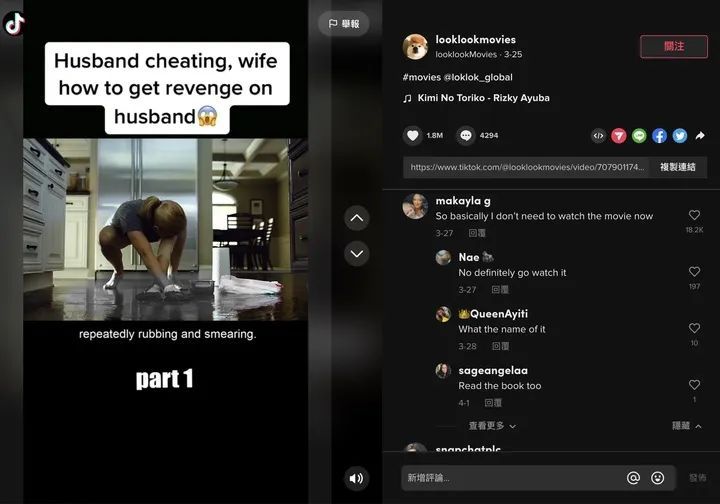 在 TikTok 上,热门电影解说账号的点赞量平均在 3 万左右,偶尔遇到爆款视频,点赞还能达到好几十万甚至上百万,如果把这些视频都转换成观看量来统计的话,数据将相当惊人。