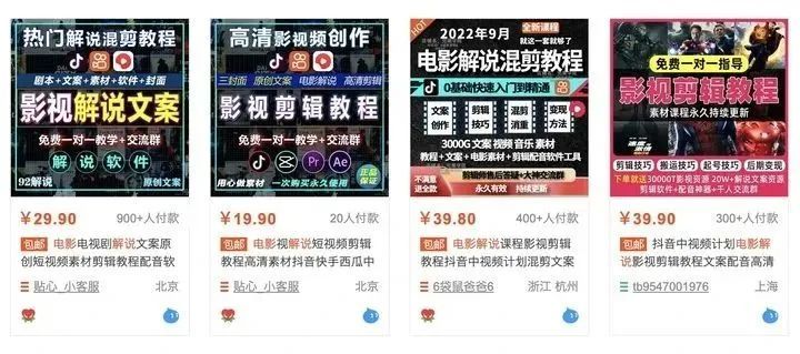 正所谓「售人以鱼不如售人以渔」,阿白发现,现在靠视频广告分成获得收益的变现方式已经落伍了,电影解说已经进入了知识付费的时代,只要花上 39 块钱,就能获得全套剪辑软件、配音软件、文案、视频素材以及剪辑方法,手把手帮你养成百万大号。