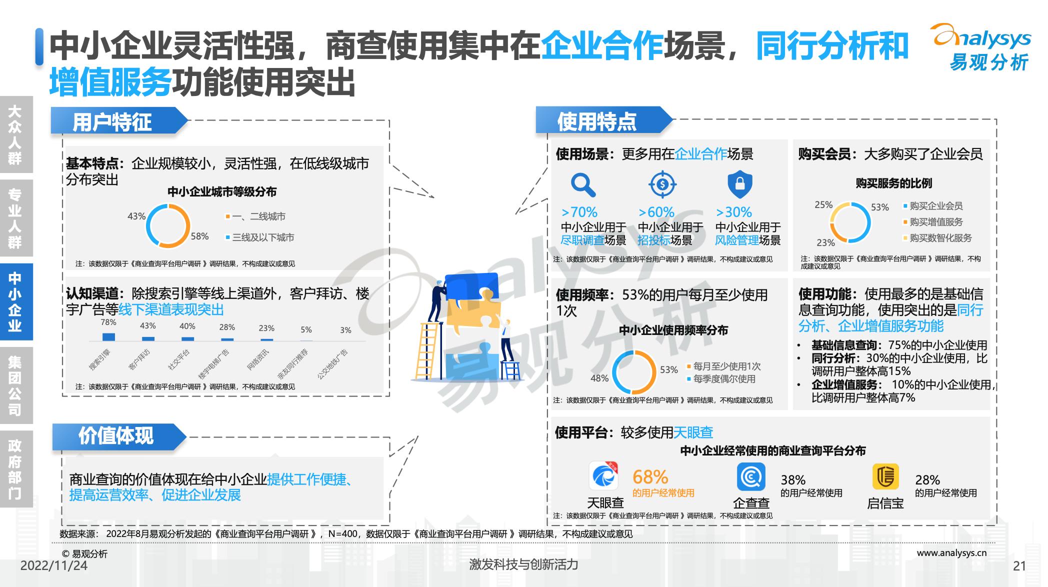 在易观分析发布的商查报告中显示,超过70%的中小企业使用商查服务进行尽职调查、超过60%的中小企业用于招投标场景。53%的中小企业购买了企业会员,23%购买了增值服务,还有25%购买了数智化服务。中小企业最爱使用的商业查询平台为天眼查,有68%的用户使用率。