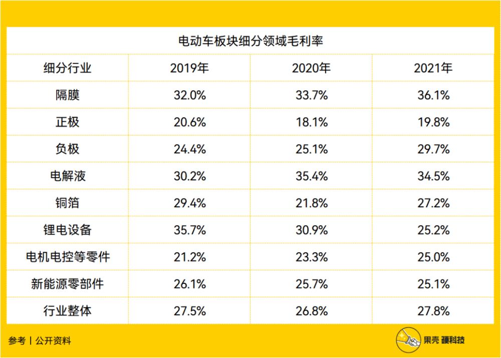但如果通览电动车板块细分领域毛利率,则会发现,隔膜才是最赚钱的分支。