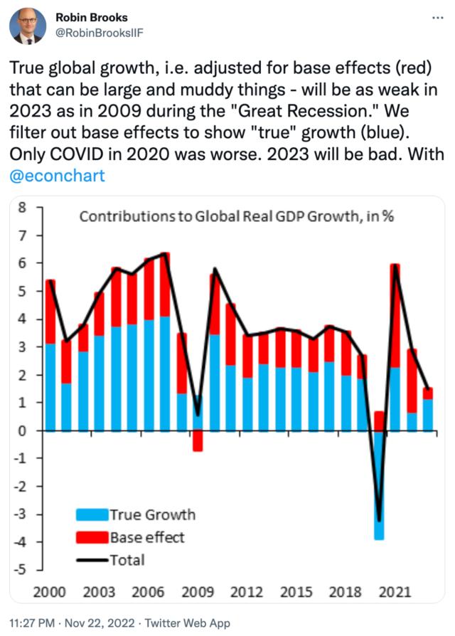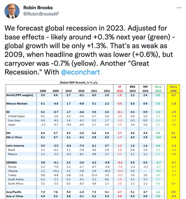 11月22日,国际金融研究所(IIF)首席经济学家 Robin Brooks 在推特上表示,对于2023年来说,全球衰退是“最好的情况”。他认为,根据基数效应的调整,明年全球经济增长将只有1.3%,和2009年一样疲软——当时整体经济增长率只有0.6%。
