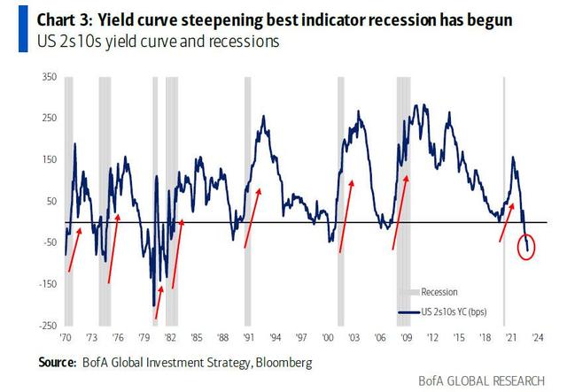 美国银行首席投资策略师 Michael Hartnett 最近在一份报告中指出,美国2年期和10年期国债收益率曲线的倒挂程度正处于1982年2月以来最严重的时期,收益率曲线倒挂是过去50年经济衰退的最佳先行指标。