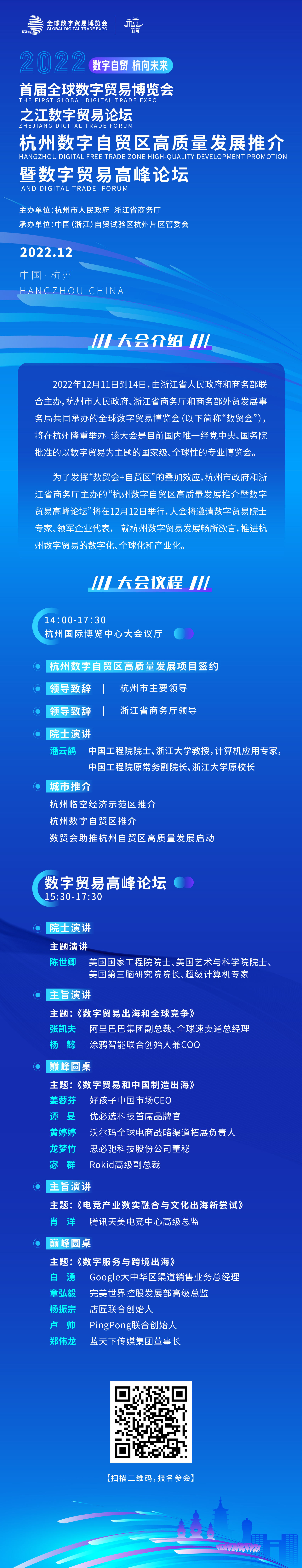 这也就是为什么,2022年12月11日至14日,首届全球数字贸易博览会(以下简称“数贸会”)即将在杭州举行。这是目前中国唯一经党中央、国务院批准的以数字贸易为主题的国家级、全球性的专业博览会。