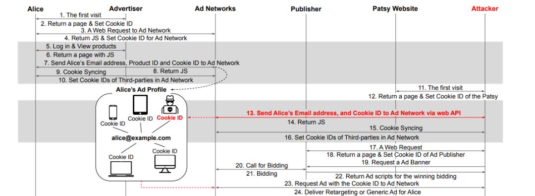 而正是这种复杂的信任关系,被攻击者利用起来混淆广告网络,从而将无特权的攻击者的浏览器链接到受害者的身份,“冒充”广告网络受害者。