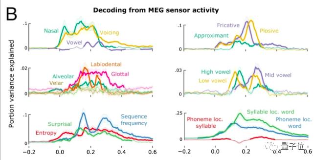 结果显示,大脑可对声音信号进行理解(解码),平均反应时间在50-300ms之间。在诸多特征中,声音大小、频率、元辅音、鼻音、擦音等声学信号激发的MEG信号更高,相比下,信息量大小及音节位置激发较小。