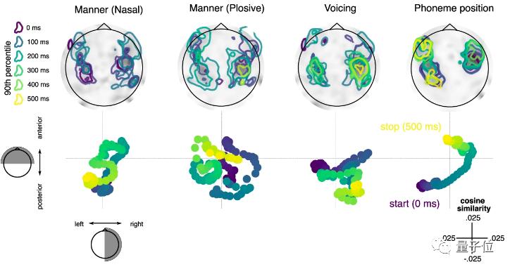 随时间推移,音量、爆破音、鼻音等声音特征信号仍集中在听觉皮层传递,但音素位置(最右)信号却传递到了额叶位置。