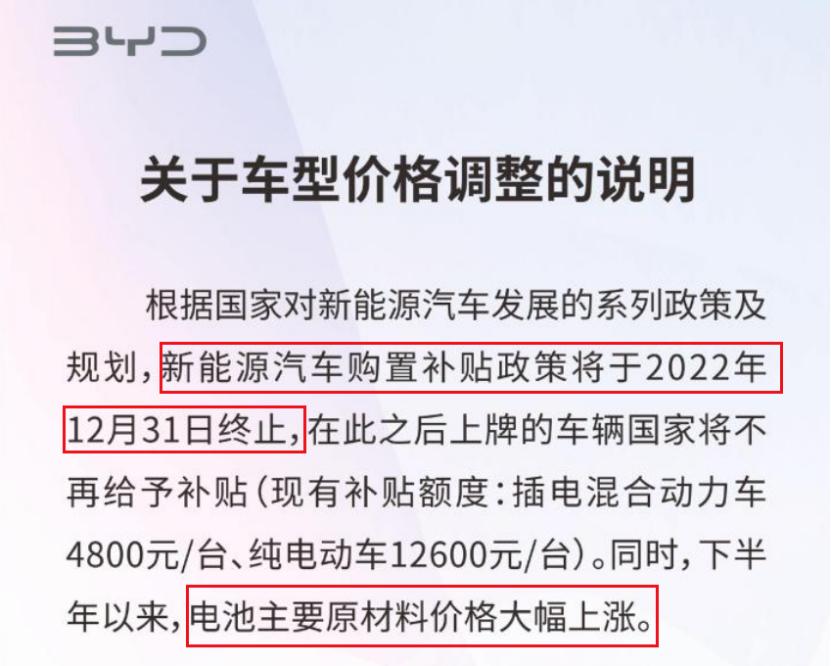 对于此次涨价,比亚迪在公告中也提及了具体原因。一方面是新能源汽车购置补贴政策将于2022年12月31日终止,在此之后上牌车辆国家将不再给予补贴;二是电池主要原材料价格大幅上涨。