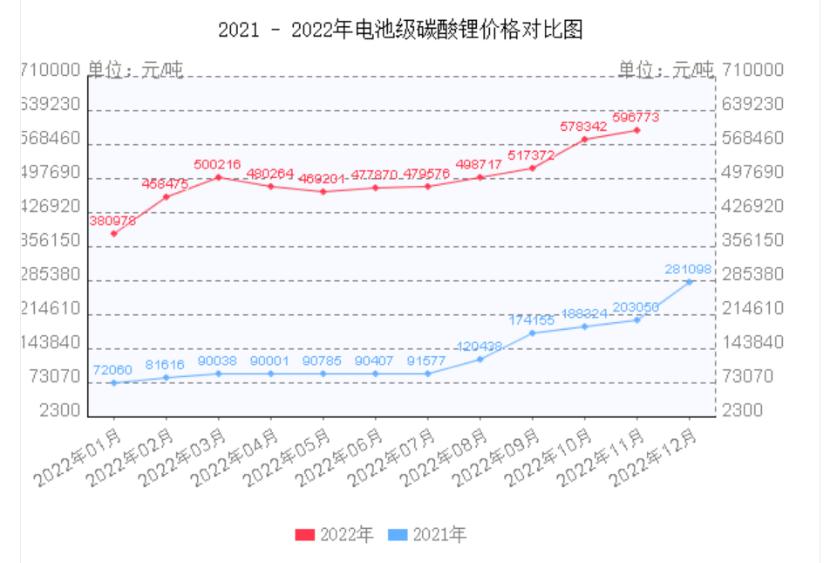 据上海钢联11月23日发布的数据,电池级碳酸锂现货均价报59万元/吨,去年1月初该原材料的报价为6.2万-6.7万元/吨左右,涨了近10倍。