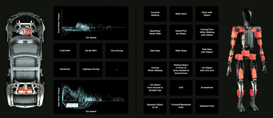 上图橙色部分为汽车和机器人身上的执行器,执行器就是机器的物理驱动装置,在左侧一辆特斯拉中包含前后 2 个执行器,而右边的 Optimus 包含 28 个执行器,最大的不同是汽车的执行器用于加速,例如从 0 加速到 60 英里/每小时、城市驾驶以及高速驾驶等场景。