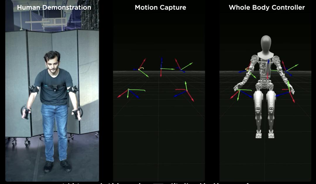 下图通过动捕装置获取人类小哥的一组动作向量,可视化的关键帧,融合了手部、肘部和部分躯干的数据,然后这组数据被映射到 Optimus 身上,下一步再进行线上适配 Optimus 的动作,以及根据不同真实世界的场景来调整动作库中的一些运动轨迹。