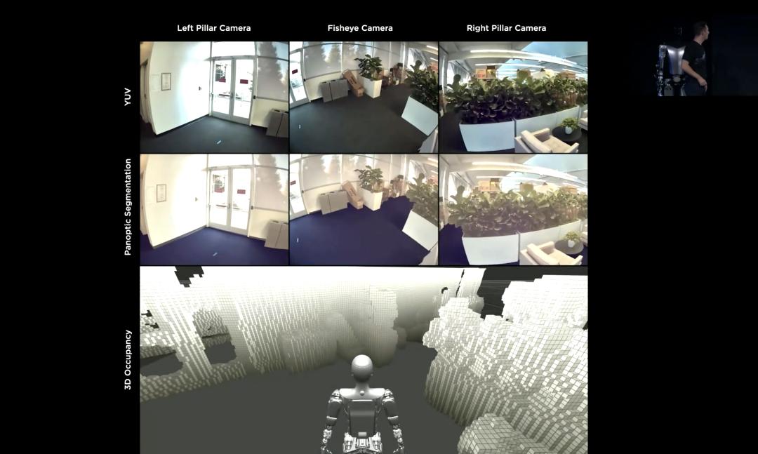 说完硬件,来说说软件。研发人员列举了生活当中通过汽车搬东西以及机器人搬东西两个场景,说明两者的共性以及在软件技术上的可复制性,例如训练机器人在室内办公环境下行走所需的神经网络来自特斯拉 Autopilot 技术。