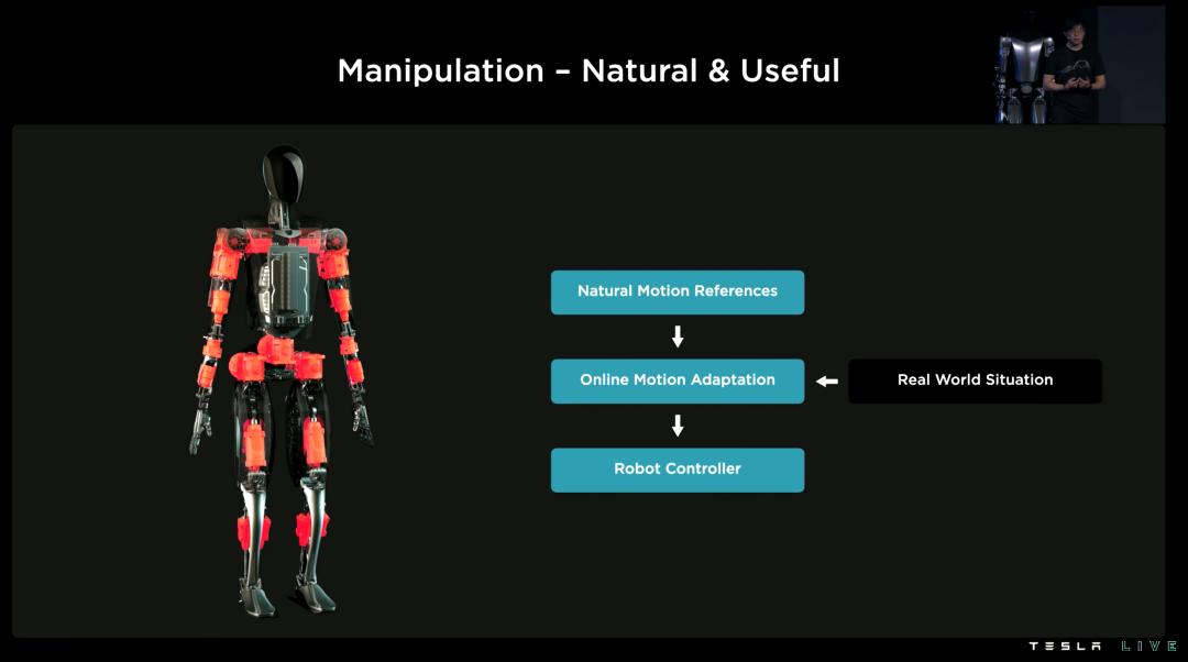 相反, Optimus 可能并不知道当前的目的是什么,而它可能应用的场景会更多和碎片化,例如先前走、上楼梯、下蹲和回避障碍等,甚至是让 Optimus 拧螺丝。