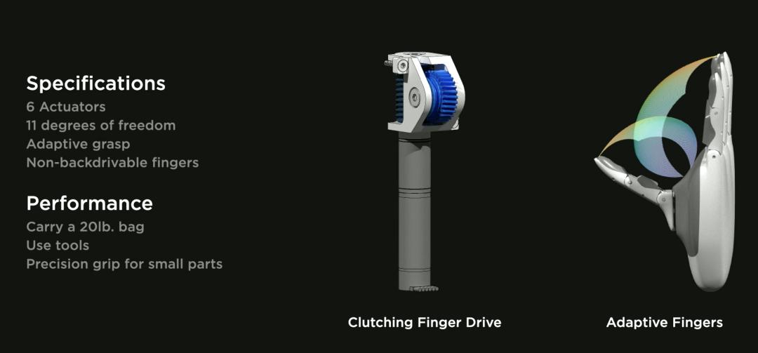 此外,Optimus 的设计还借鉴了人类膝关节骨骼和五指的设计结构。例如,人手每秒可以移动 300 次,手掌上有数以万计的传感器,特斯拉也希望在 Optimus 身上也有这么多传感器,能够像人手一样灵活,抓住并操作一些装置;在手部设计上,特斯拉参考了生物学上手部的结构来设计机器人手指的排布、柔韧性程度以及强度。