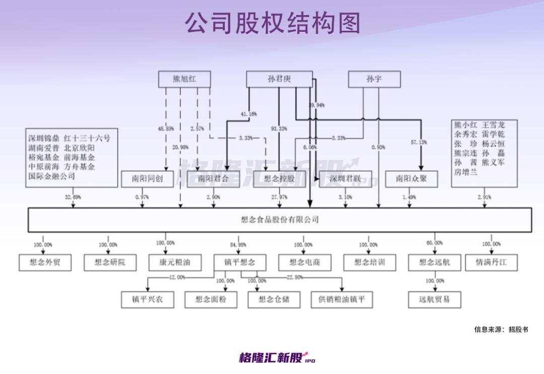 根据招股书,公司实际控制人为孙君庚、熊旭红夫妇。孙君庚、熊旭红夫妇通过想念控股、南阳众聚控制公司 29.46%的股份,同时还分别直接持有公司 6.06%、20.98%的股份,合计控制公司 56.50%的股份,为公司实际控制人。