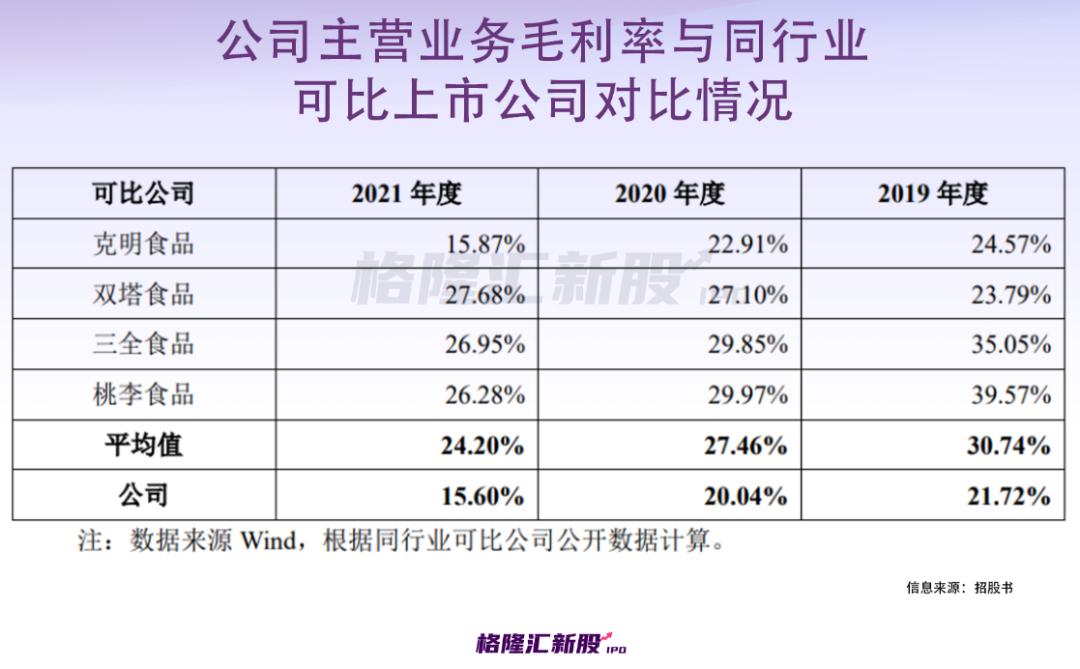 报告期内,想念食品的综合毛利率在走下坡路,分别为21.29%、 19.02%、14.19%,系主营产品毛利率的变动及不同毛利率产品销售结构变动所致。其中,2019年-2021年,想念食品主营业务毛利率分别为21.72%、20.04%、15.6%,均低于同行业可比上市公司均值。
