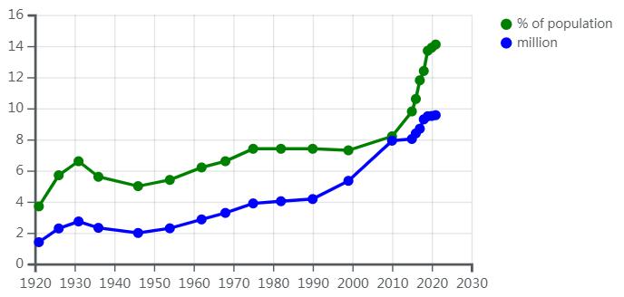 2019年,根据法国国家经济统计研究所的数据,法国的移民人口有650万人,占了总人口的将近10% 。
