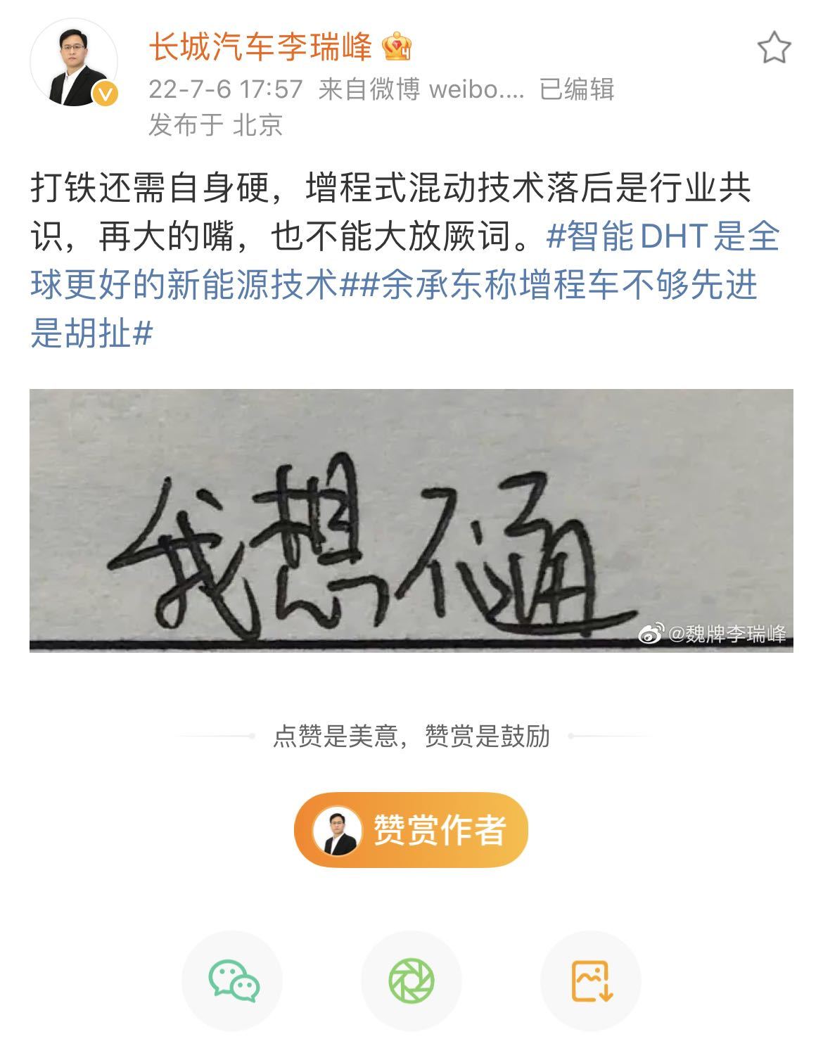 今年6月,华为余承东直言,“说增程车不够先进的都是胡扯,增程模式是目前最适合的新能源车模式”, 拉开大佬之间新一轮论战。魏牌CEO李瑞峰隔空喊话,“打铁还需自身硬,增程式混动技术落后是行业共识,再大的嘴,也不能大放厥词。”