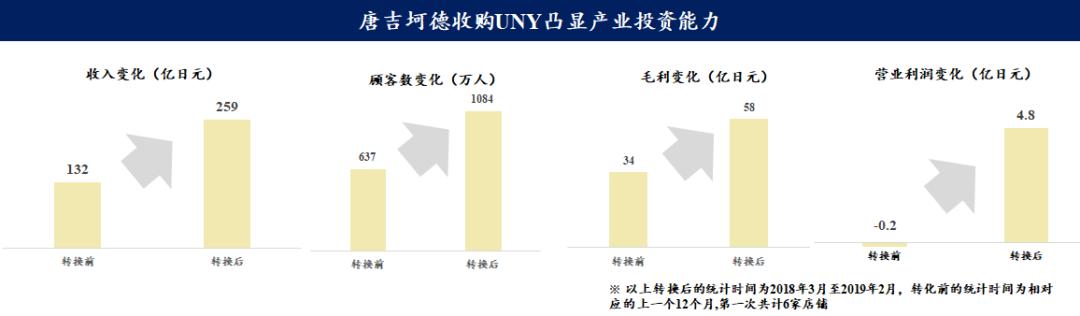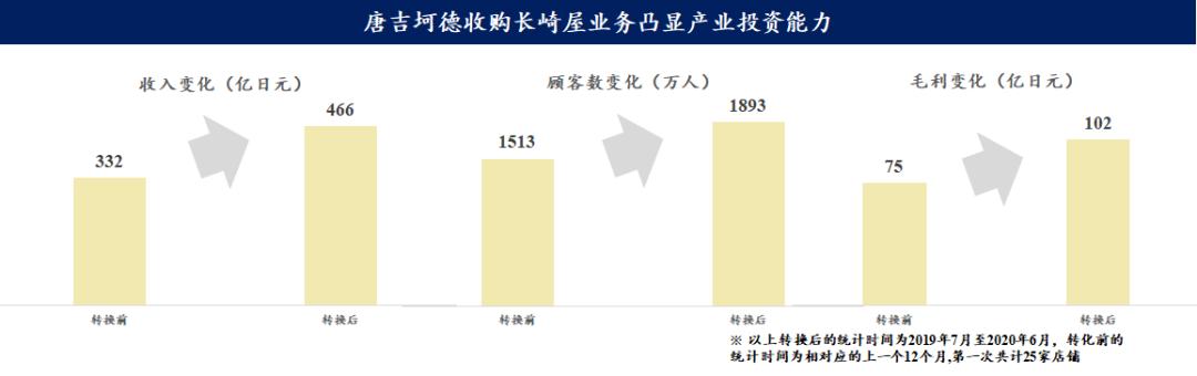 长崎屋是大型的综合类超市,在肉类和鱼类销售上的资源和经验,使得唐吉坷德顺利开拓了生鲜品类。接手长崎屋之后,唐吉诃德将现有的店铺逐步改装为“MEGA 唐吉诃德”,开大店、拓SKU使得长崎屋业绩出现大幅翻转式提升。SKU数量扩大到6万到10万,门店面积拓展到9000平方米以上,以家庭消费为目标的顾客数量逐渐增加。这一笔收购让唐吉诃德初次尝到了借收购来扩宽业务线的甜头。