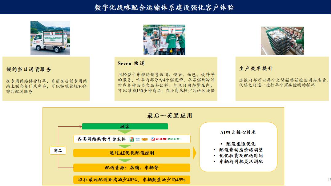 7-Eleven在日本提供预约当日送货上门的服务;轻型货车移动商店服务;门店在验货的数字化环节更为便捷(门店端可按箱验货);以及最后一公里应用Ai技术不断优化,这期间无疑投入了大量精力在做数字化战略。