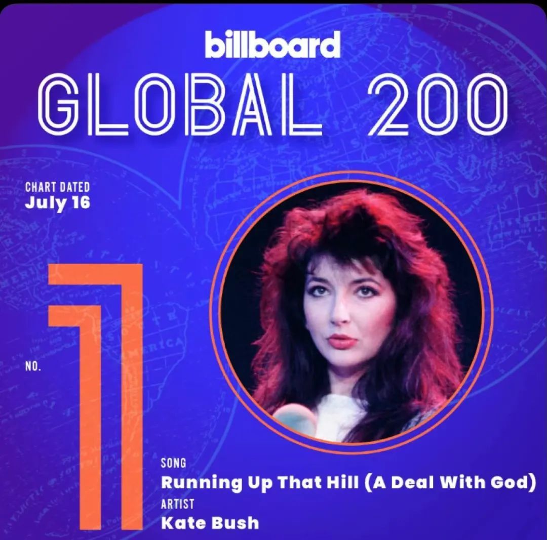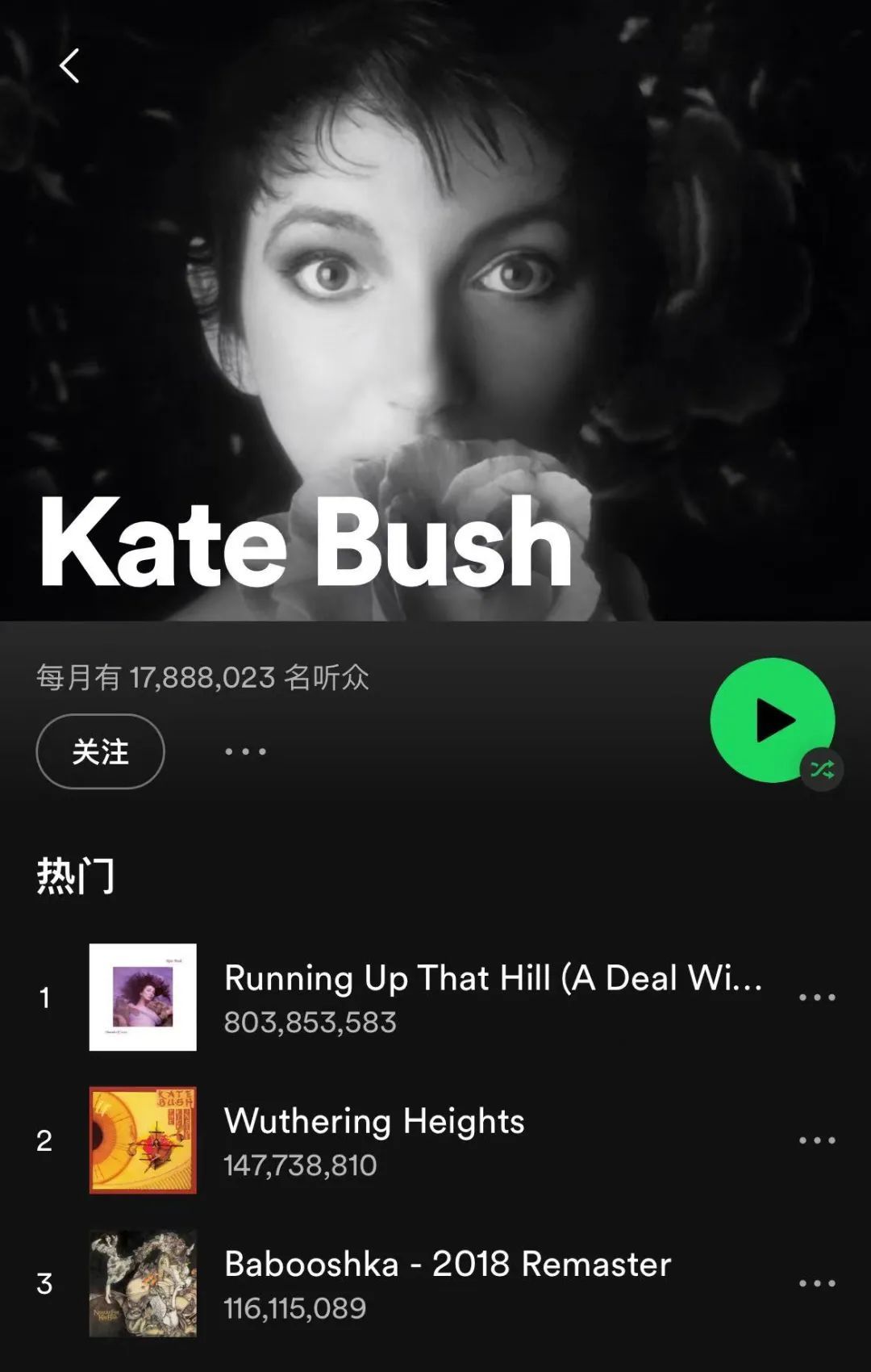 作为今年世界上最受欢迎的歌曲,Kate Bush 的《Run Up That Hill》因为被用作《怪奇物语》的配乐,这1985年发行的歌曲仅在美国流媒体数据就飙升了9900%。剧集播出三周后,在综合全球200多个国家销量和流媒体数据的Billboard’s Global 200 榜单中,《Running Up That Hill》排名第一。