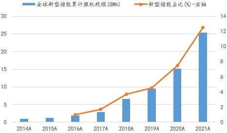 全球已投运新型储能累计装机及占比示意图