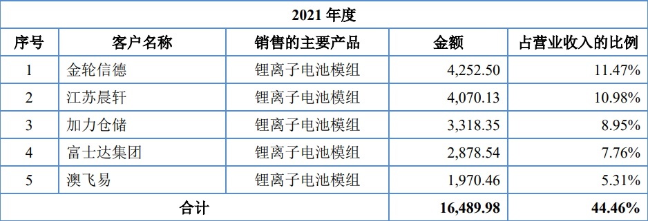 公司深耕锂电池产业多年,目前已经和多家知名下游终端企业达成合作关系。2021年公司前五大客户分别是金轮信德、江苏晨轩、加力仓储、富士达集团、澳飞易。