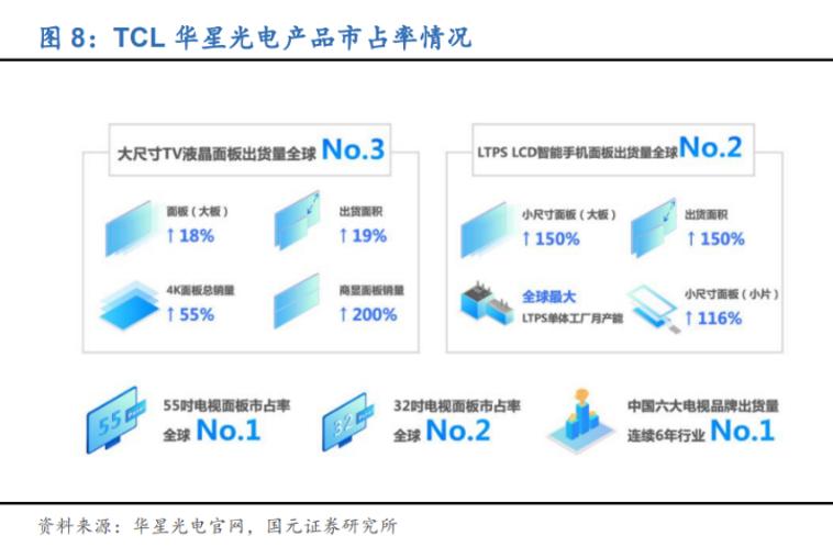 说到大尺寸,TCL科技的大尺寸面板产品确实很强。比如,8K和120HZ高端面板市场份额全球第一,65吋和75吋超市场份额全球第二,大尺寸交互白板及数字标牌市场份额全球第一。