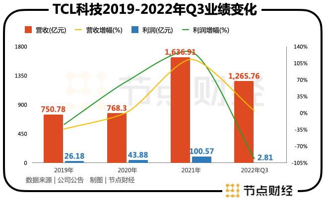 以最为重要的TCL科技(000100.SZ)为例,不久前发布的三季度财报显示,报告期内,其总营业收入为1265.76亿元,同比增长4.5%;实现归母净利润2.81亿元,同比下降96.9%。