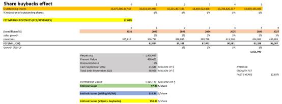 其次,我将虚拟现实和增强现实产品AR/VR包括在计算中,采用最可靠的苹果分析师之一,来自TF International Securities和Global Data Forecasts的Ming-Chi Kuo所做的假设;目标是估算2023年推出的AR/VR产品所产生的预计自由现金流(FCF)的现值。最后,我将股票回购对内在价值的影响计算。