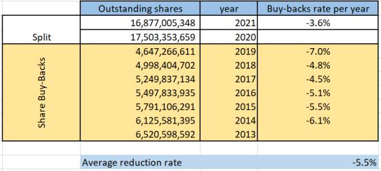 我们考虑2013年至2019年的股票回购,因为2020年出现了4比1的拆分。以平均速度计算,苹果回购了上一年已发行股票的5.5%。现在,我们将为预计到2026年的未来几年申请5%: