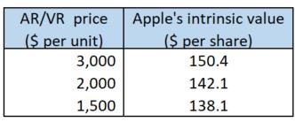 可能削弱我们论点的第三个因素与AR/VR产品的平均价格有关。在我们的计算中假设这些产品的平均单价为3,000美元。如果在其他因素不变的情况下价格低于预期,内在价值将受到影响: