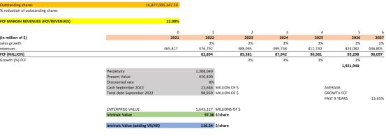 在这些假设下获得的未来FCF的现值(PV)为3203.99亿美元。这个数字将被累加到先前在第一阶段计算的企业价值。从这个意义上讲,我们保留了第一阶段所做的所有假设;因此,我们的新内在价值包括AR/VR产品预测为每股116.34美元: