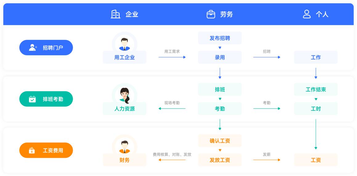用工单位在蓝鸟云SaaS系统内发出用工需求单,劳务公司可在蓝鸟云平台接单,并在系统中确认出工的临时工人及对工人进行排班。临时工人在系统确认出工后,根据系统指示上岗,在蓝鸟云系统完成用工考勤,最后按系统记录结算工资。
