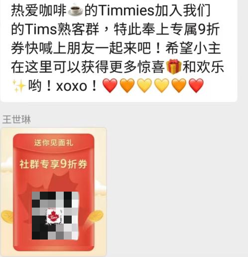 在北京工作的琪琪也表示,公司写字楼旁边的Tims在前台也可以扫描二维码加微信群,群里会定期发放社区专享的优惠券。“同样作为一个外资咖啡的企业,这点就比星巴克‘入乡随俗’得快。”琪琪说道。