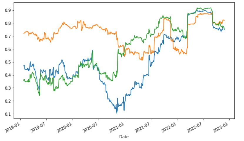 上图中乃是我们所整理的上述三家企业每日股价变动的动态相关性走势(120天滚动窗口),我们之所以未在图中对不同颜色折线进行标准,主要原因也在于希望大家忘掉颜色,去看2021年下半年之后折线的走势:高度的一致性。