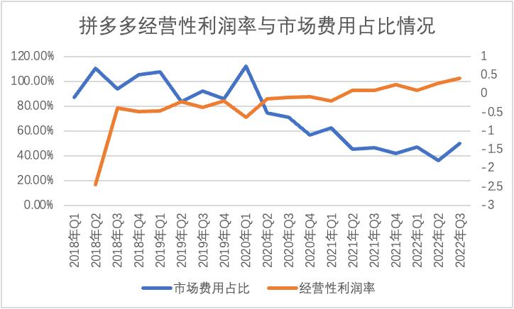 在上图中我们可以看到,2020年之后的,拼多多市场费用占比呈现快速的下行趋势,与此同时经营性利润逐渐好转,不过相较之下,经营性利润的变动幅度要弱于市场费用。