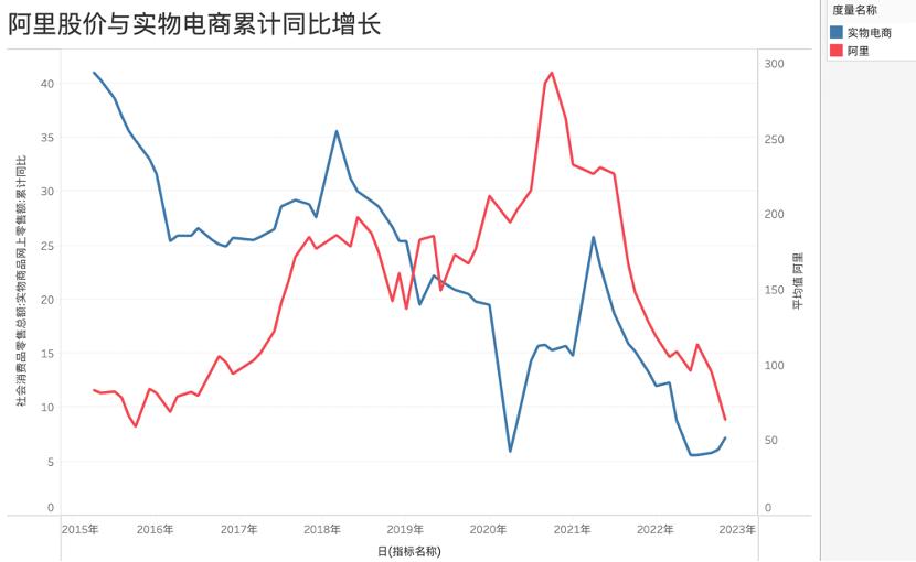 由于三家企业保持高度的相关性,我们主要对比阿里与全国实物电商的走势情况,见下图