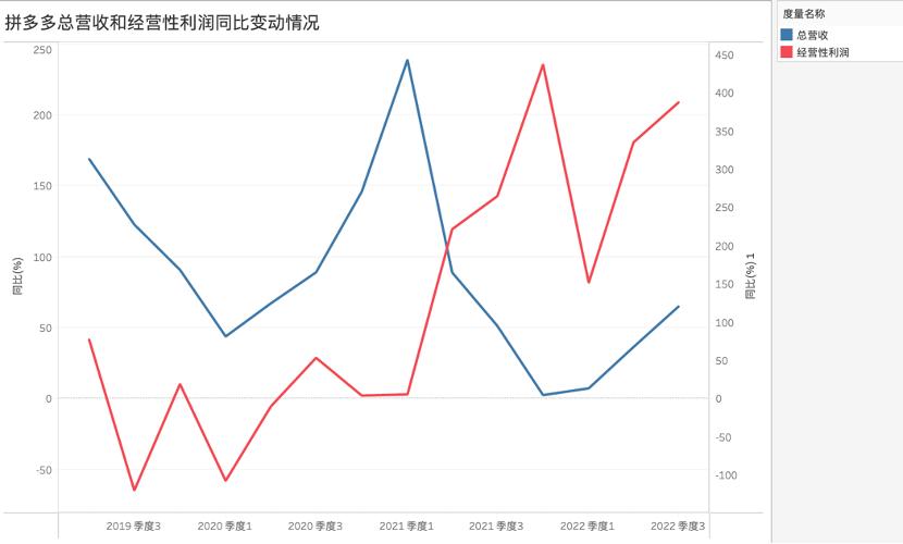 我们首先整理了2019年至今拼多多总营收和经营性利润的同比变动情况,见下图