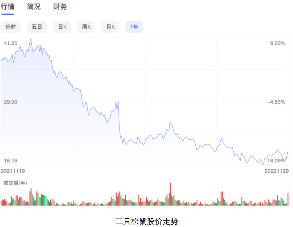 2020年开始,三只松鼠未能继续创纪录,营收回落至百亿以下,下滑态势明显且被竞争对手反超。财报数据显示,2022年第三季度,三只松鼠公司营收12.19亿元,同比下降32.63%,净利润1136.5万元,同比下降87.43%。