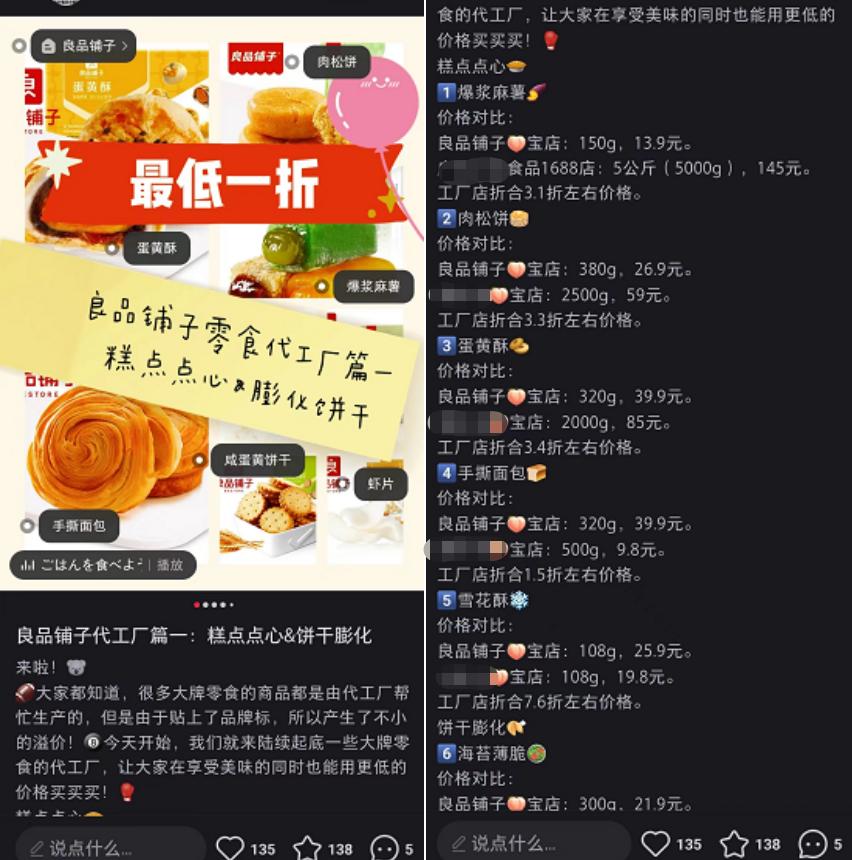 反映到消费行为上,市场掀起了一场寻找代工厂行动,小红书等平台上,良品铺子等品牌的代工厂被一一列出。消费者发现,与“高端品牌”贴牌后的售价相比,代工厂的对应产品售价可能低至3折,甚至1折。